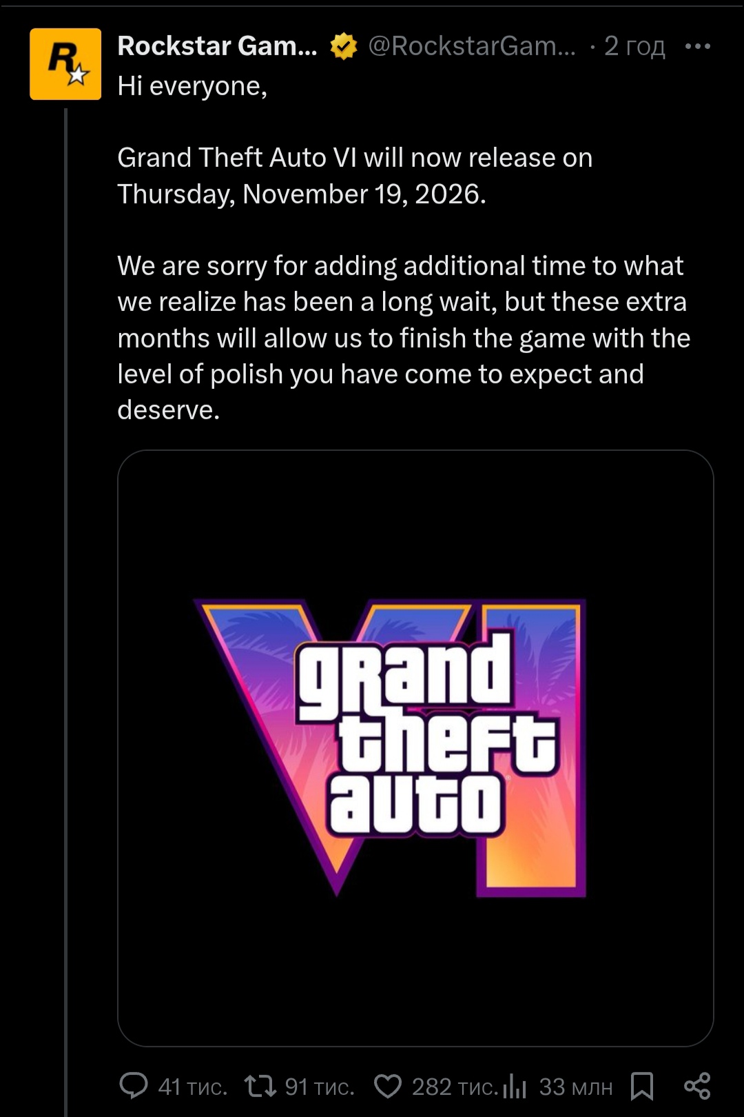 Official: Grand Theft Auto VI Arrives on November 19, 2026