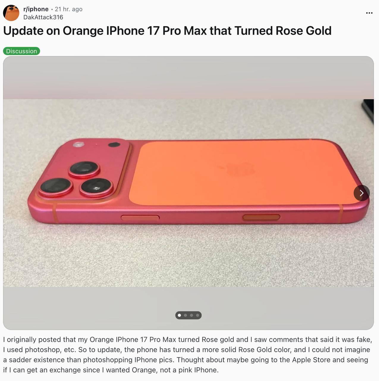 Some iPhone 17 Pro Max users have been surprised to find their phones changing color over time. The orange finish is fading in parts of the device, replaced by a gold-pink tint.